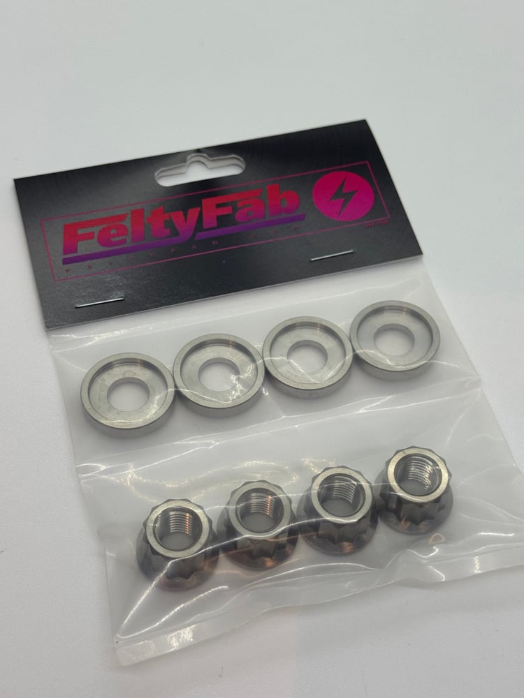 FeltyFab’s titanium strut tower nut kits are engineered for serious performance. Machined from forged Ti-6Al-4V aerospace-grade titanium, these nuts feature wide flanges for increased contact area—delivering improved load distribution and clamping force across your strut mounts. Whether you're dialing in suspension geometry or upgrading corroded factory hardware, these are true performance fasteners, not decorative dress-up pieces.